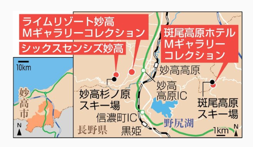 妙高市の妙高高原地域や隣接する長野県の斑尾・野尻湖地域でリゾート開発を計画している外資系不動産投資ファンドのペイシャンス・キャピタル・グループ(PCG)は、妙高市関川のホテル「ライムリゾート妙高」と長野県飯山市の「斑尾高原ホテル」を、仏ホテル大手のアコーが展開する「Mギャラリーコレクション」のホテルとして開業すると発表した。2027年末開業予定で、国内外からの誘客を狙う。