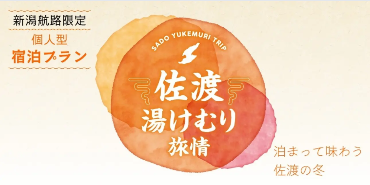 佐渡汽船は、新潟-両津航路限定の旅行商品「佐渡湯けむり旅情」を販売している。出発日は12月1日〜来年3月31日で、カーフェリー2等往復券と1泊2食の宿泊費がセットになっている。選べる宿泊施設は全6施設で、おけさコースは「国際佐渡観光ホテル八幡館」(1人旅可)と「湖畔の宿吉田家」。ときコースは「いさりびの宿道遊」「ホテルニュー桂」「みなみ旅館」が1人旅可で、他に「朱鷺伝説と露天風呂の宿きらく」。