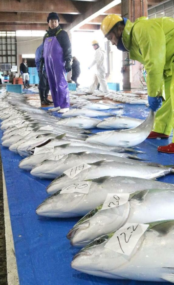 年の瀬を迎え、佐渡市の冬の味覚、寒ブリ漁で27日、大小合わせて200匹余りのブリが揚がった。漁業者によると、年内に100匹以上のまとまった水揚げがあるのは数年ぶりという。佐渡水産物地方卸売市場(佐渡市春日)には脂の乗ったブリがずらりと並び、活気に包まれた。